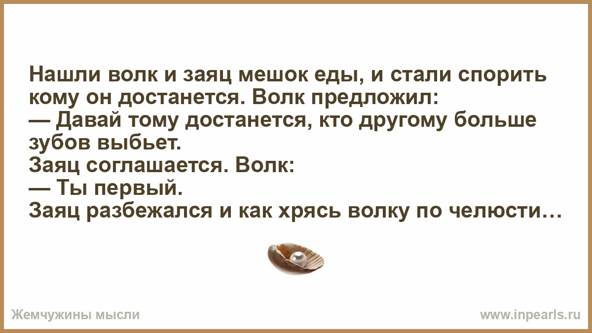 Заяц разбежался и как хрясь волку по челюсти. Волк выплёвывая зубы: