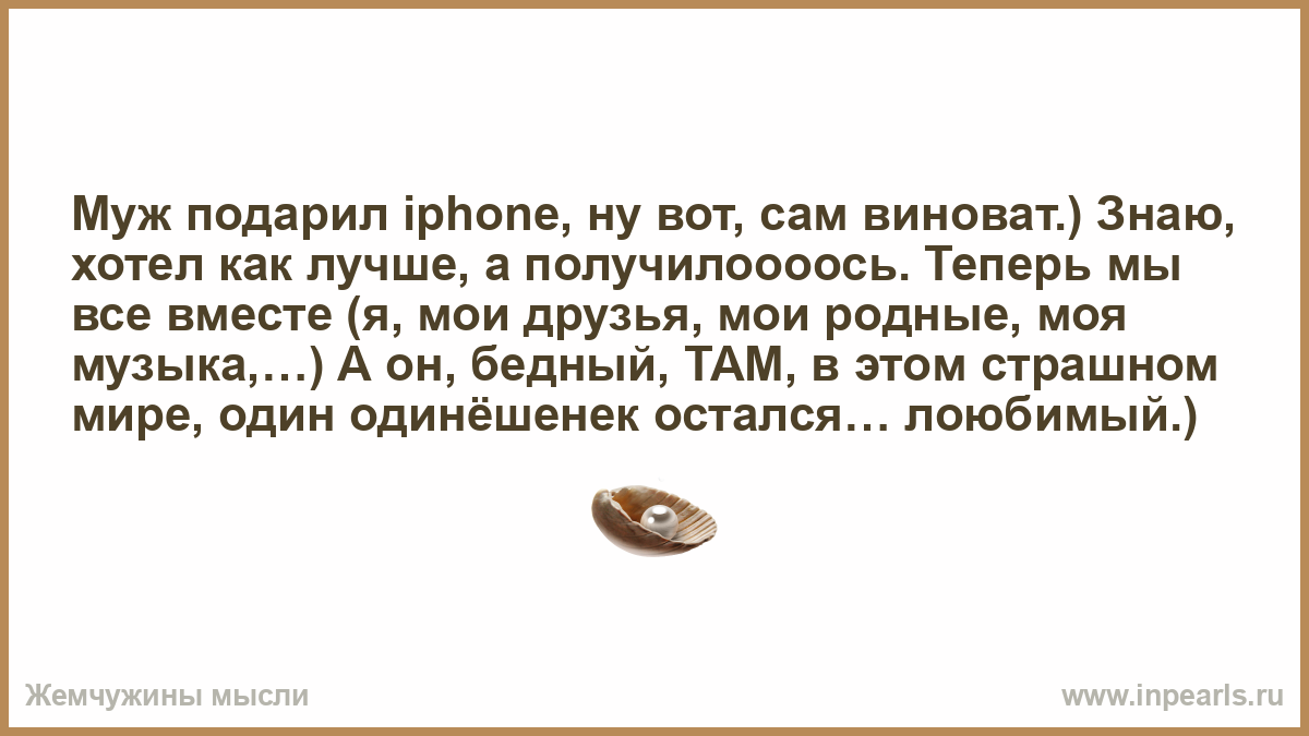 Муж подарил iphone, ну вот, сам виноват.) Знаю, хотел как лучше, а получилоооось. Теперь мы все вместе (я, мои друзья, мои родные, моя музыка,…) А он, бедный, ТАМ, в этом страшном мире, один одинёшенек остался… лоюбимый.)