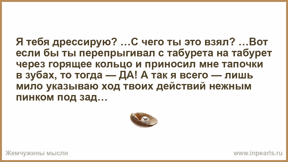 Я тебя дрессирую? …С чего ты это взял? …Вот если бы ты перепрыгивал с табурета на табурет через горящее кольцо и приносил мне тапочки в зубах, то тогда — ДА! А так я всего — лишь мило указываю ход твоих действий нежным пинком под зад…