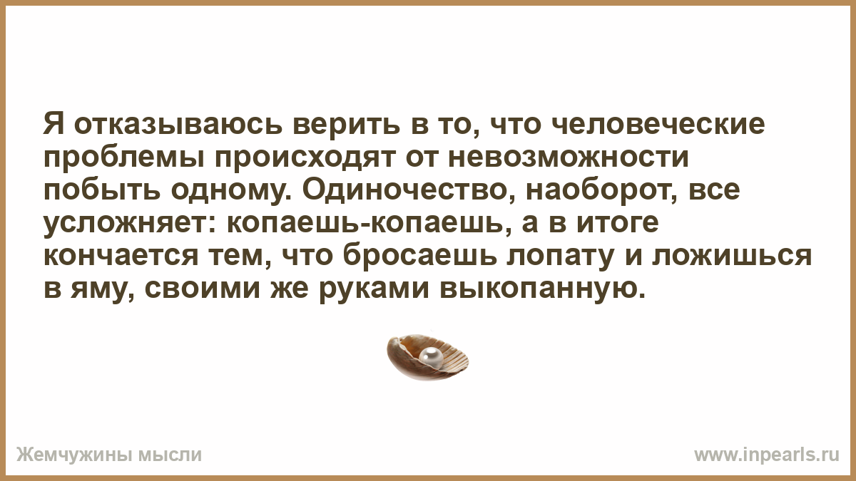 Я отказываюсь верить в то, что человеческие проблемы происходят от невозможности побыть одному. Одиночество, наоборот, все усложняет: копаешь-копаешь, а в итоге кончается тем, что бросаешь лопату и ложишься в яму, своими же руками выкопанную.