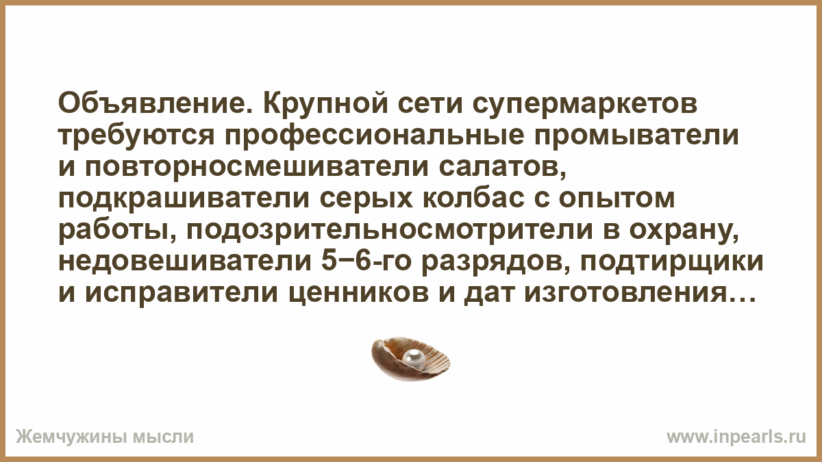Объявление. Крупной сети супермаркетов требуются профессиональные промыватели и повторносмешиватели салатов, подкрашиватели серых колбас с опытом работы, подозрительносмотрители в охрану, недовешиватели 5−6-го разрядов, подтирщики и исправители ценников и дат изготовления с дипломами о специальном образовании, всвежестимолоказаверители (можно без опыта, обучение на месте).