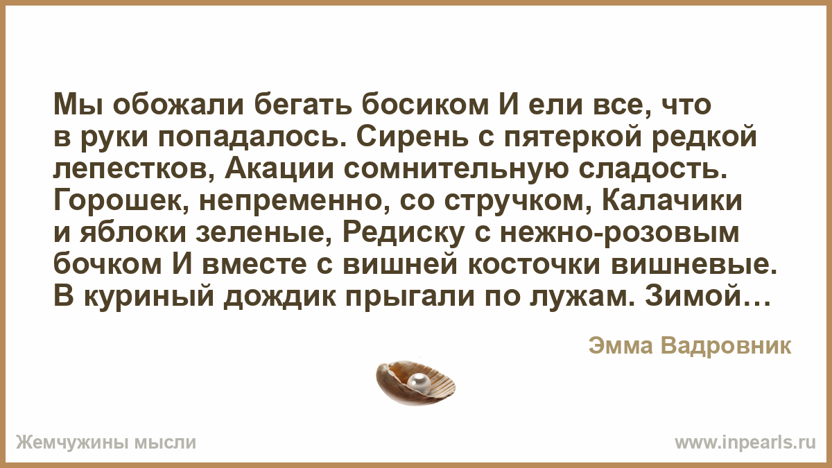 Мы обожали бегать босиком И ели все, что в руки попадалось. Сирень с пятеркой редкой лепестков, Акации сомнительную сладость. Горошек, непременно, со стручком, Калачики и яблоки зеленые, Редиску с нежно-розовым бочком И вместе с вишней косточки вишневые. В куриный дождик прыгали по лужам. Зимой сосульками хрустели, как кроты. Всего хотелось, все нам было нужно. Всем, что росло мы набивали рты. Нас нянчила земля и берегла. Она играла с нами, баловала. И угощала с раннего утра До бархатного ночи покрывала. Мы косы мыли дождевой водой, А раны подорожником лечили. Как хочется вернуться к жизни той. Туда, где это счастье нам дарили. Где раскрывала нам ладонь земля, Наполненную чудными дарами И угощала щедро и любя, Пусть пыльными, но чистыми плодами. Не чистили, не мыли ничего, А просто ели и остались живы. Недавно это было… и давно… Когда большими все деревья были…