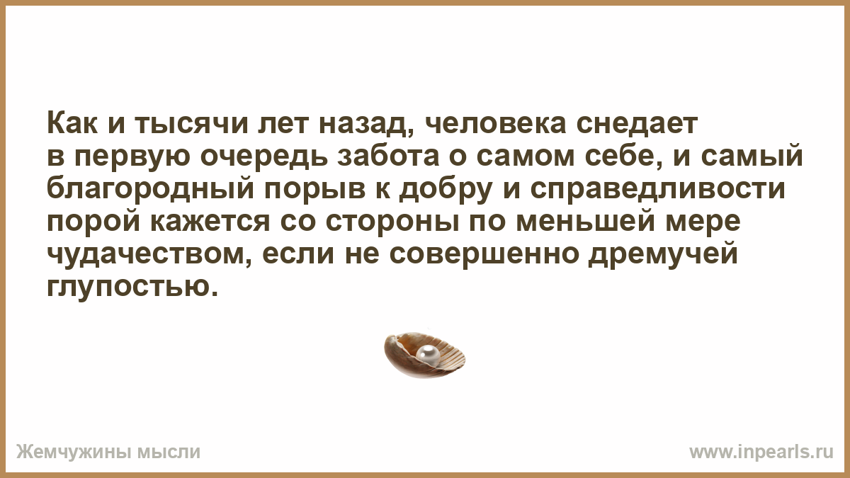 Как и тысячи лет назад, человека снедает в первую очередь забота о самом себе, и самый благородный порыв к добру и справедливости порой кажется со стороны по меньшей мере чудачеством, если не совершенно дремучей глупостью.