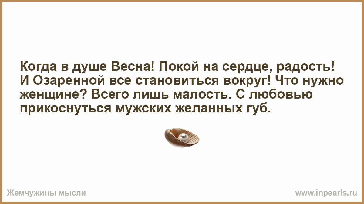 Когда в душе Весна! Покой на сердце, радость! И Озаренной все становиться вокруг! Что нужно женщине? Всего лишь малость. С любовью прикоснуться мужских желанных губ.