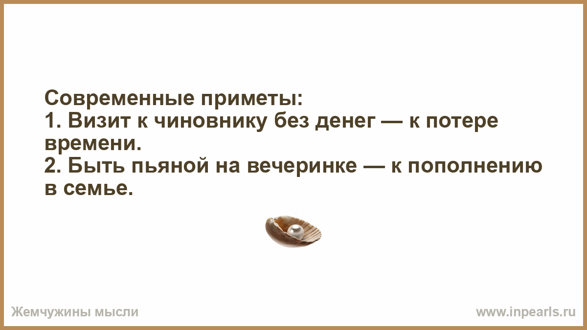 Современные приметы: 1. Визит к чиновнику без денег — к потере времени. 2. Быть пьяной на вечеринке — к пополнению в семье.
