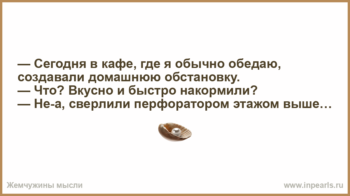 — Сегодня в кафе, где я обычно обедаю, создавали домашнюю обстановку. — Что? Вкусно и быстро накормили? — Не-а, сверлили перфоратором этажом выше…