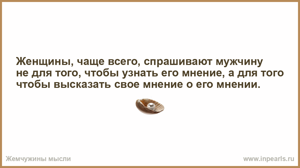Женщины, чаще всего, спрашивают мужчину не для того, чтобы узнать его мнение, а для того чтобы высказать свое мнение о его мнении.