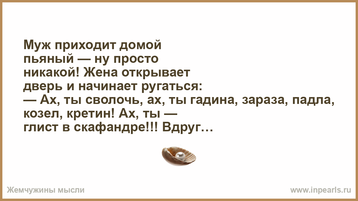 Муж приходит домой пьяный — ну просто никакой! Жена открывает дверь и начинает ругаться: — Ах, ты сволочь, ах, ты гадина, зараза, падла, козел, кретин! Ах, ты — глист в скафандре!!! Вдруг из комнаты выбегает ребенок: — Мам, ты меня звала???
