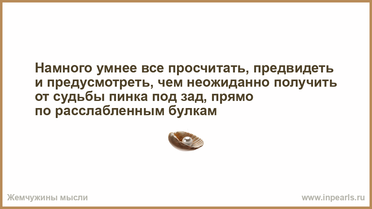 Намного умнее все просчитать, предвидеть и предусмотреть, чем неожиданно получить от судьбы пинка под зад, прямо по расслабленным булкам