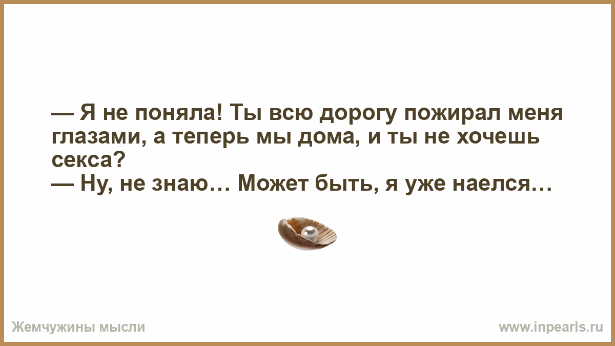 — Я не поняла! Ты всю дорогу пожирал меня глазами, а теперь мы дома, и ты не хочешь секса? — Ну, не знаю… Может быть, я уже наелся…
