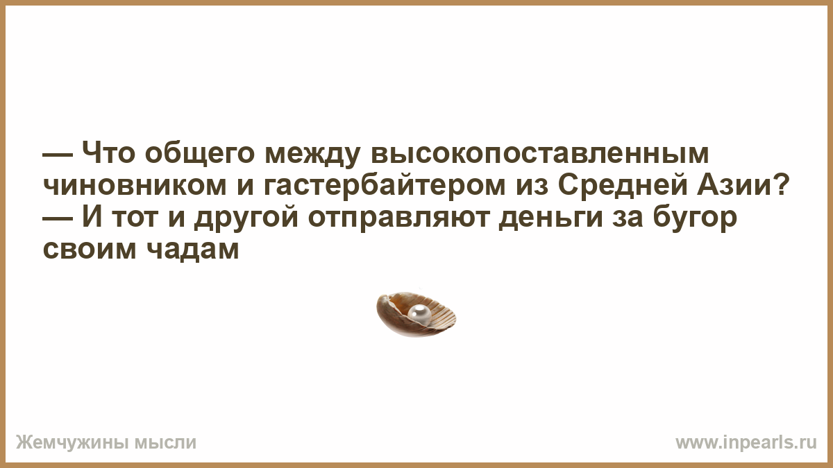 — Что общего между высокопоставленным чиновником и гастербайтером из Средней Азии? — И тот и другой отправляют деньги за бугор своим чадам
