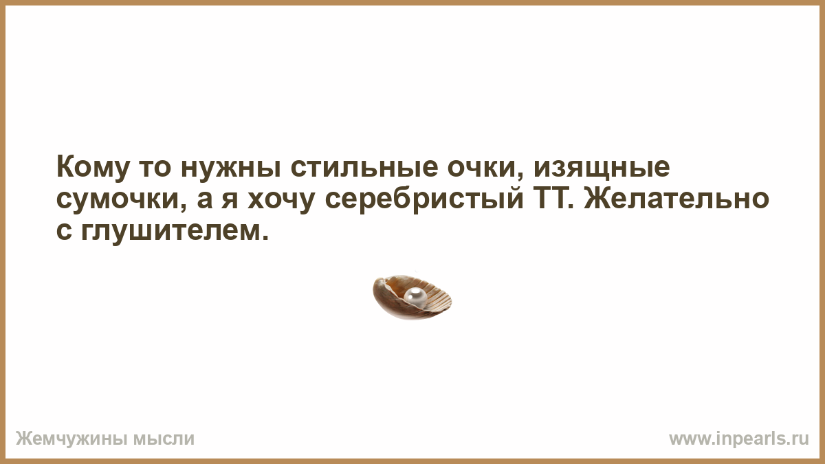 Кому то нужны стильные очки, изящные сумочки, а я хочу серебристый ТТ. Желательно с глушителем.