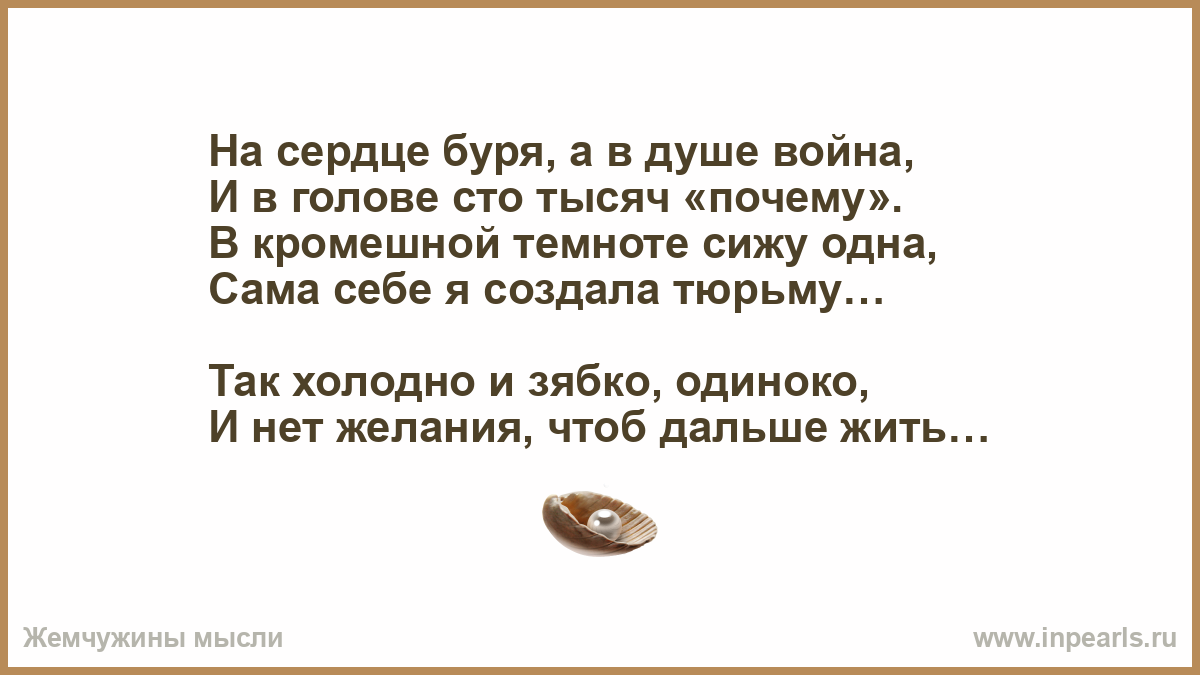 В общем, хватит, пожалуй, любите, пожалуйста, ближних. Тех, кто варит вам кофе, кто утром сопит у плеча. Я устала. Мне хочется старых зачитанных книжек, шоколада, и чая, и, чтобы негромко стучал по зашторенным окнам холодный, настойчивый дождик, чтобы кошка мурлыкала, боком прижавшись ко мне, чтобы не был мне нужен — ни тот, кто любого дороже, ни, тем более, тот, кому я всех дороже вдвойне…