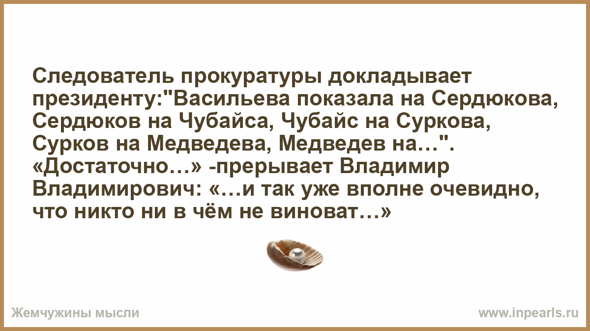 Следователь прокуратуры докладывает президенту:"Васильева показала на Сердюкова, Сердюков на Чубайса, Чубайс на Суркова, Сурков на Медведева, Медведев на…".
