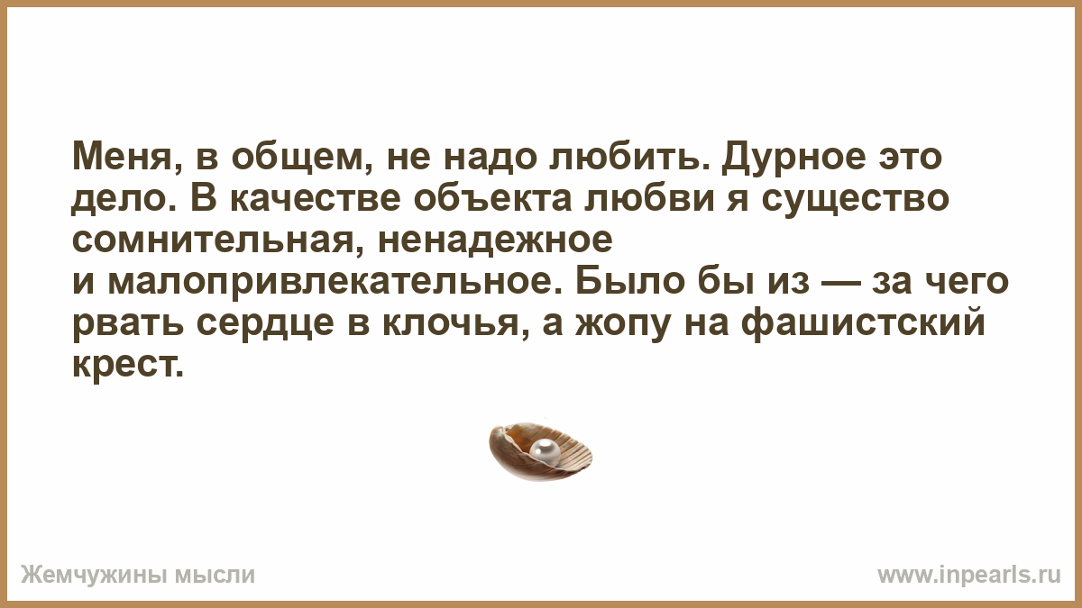Меня, в общем, не надо любить. Дурное это дело. В качестве объекта любви я существо сомнительная, ненадежное и малопривлекательное. Было бы из — за чего рвать сердце в клочья, а жопу на фашистский крест.