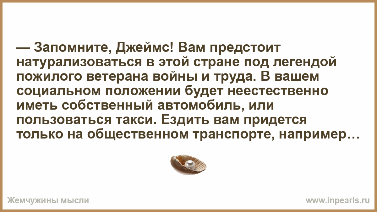 — Запомните, Джеймс! Вам предстоит натурализоваться в этой стране под легендой пожилого ветерана войны и труда. В вашем социальном положении будет неестественно иметь собственный автомобиль, или пользоваться такси. Ездить вам придется только на общественном транспорте, например, автобусе. И учтите, место в этом автобусе вам уступят с радостью только в том случае, если этот автобус будет ритуальным!