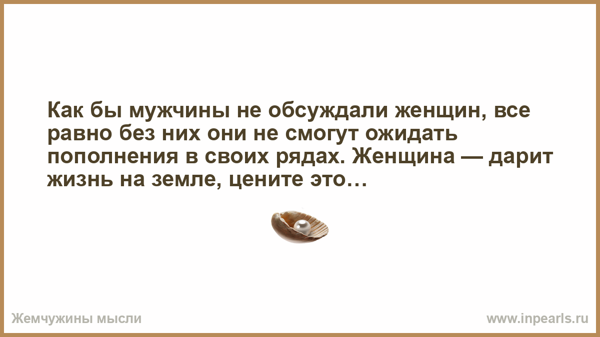 Как бы мужчины не обсуждали женщин, все равно без них они не смогут ожидать пополнения в своих рядах. Женщина — дарит жизнь на земле, цените это…