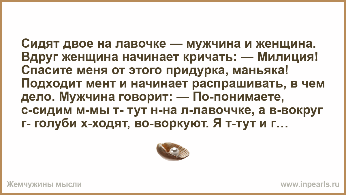 Сидят двое на лавочке — мужчина и женщина. Вдруг женщина начинает кричать: — Милиция! Спасите меня от этого придурка, маньяка! Подходит мент и начинает распрашивать, в чем дело. Мужчина говорит: — По-понимаете, с-сидим м-мы т- тут н-на л-лавоччке, а в-вокруг г- голуби х-ходят, во-воркуют. Я т-тут и г- говорю: «Вот б-бы и н-нам т-так». Но по-пока я г-говорил, ситуация у го-голубей изменилась…