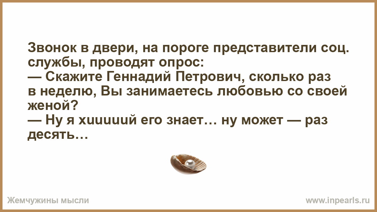 — Скажите Геннадий Петрович, сколько раз в неделю, Вы занимаетесь любовью со своей женой?