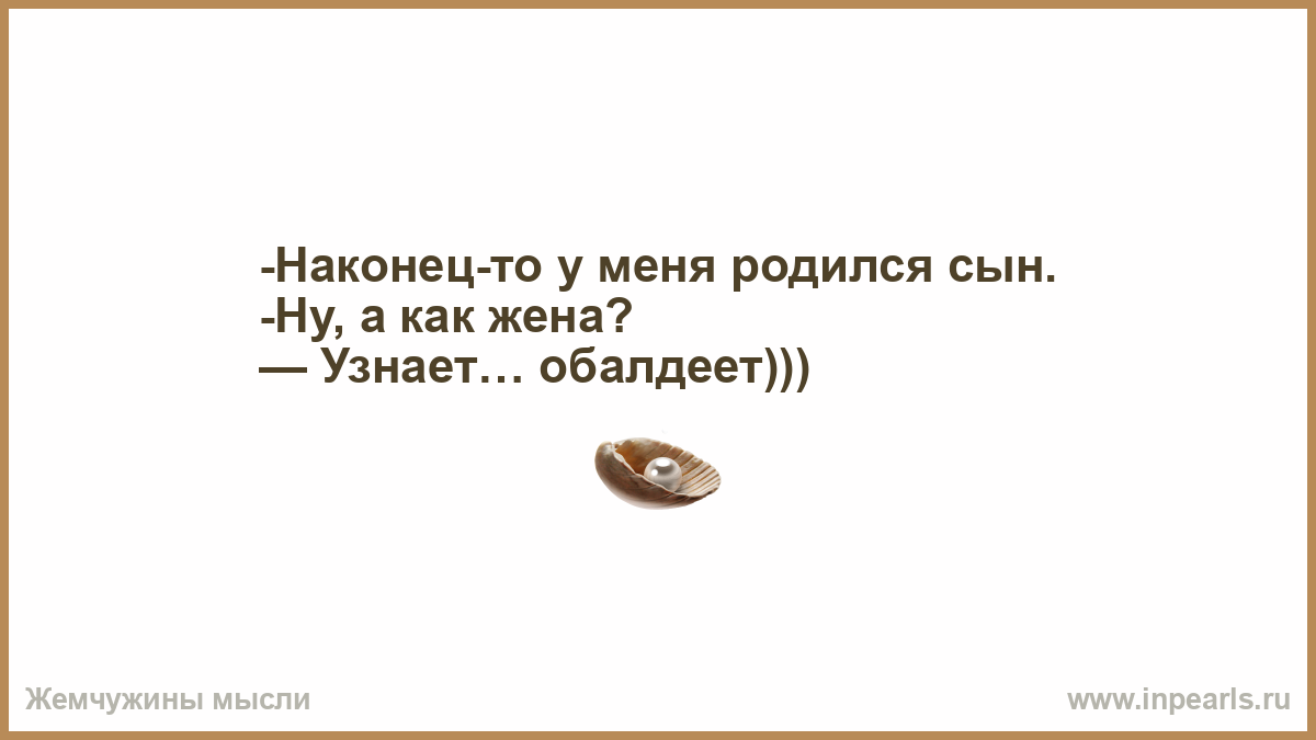 -Наконец-то у меня родился сын. -Ну, а как жена? — Узнает… обалдеет)))