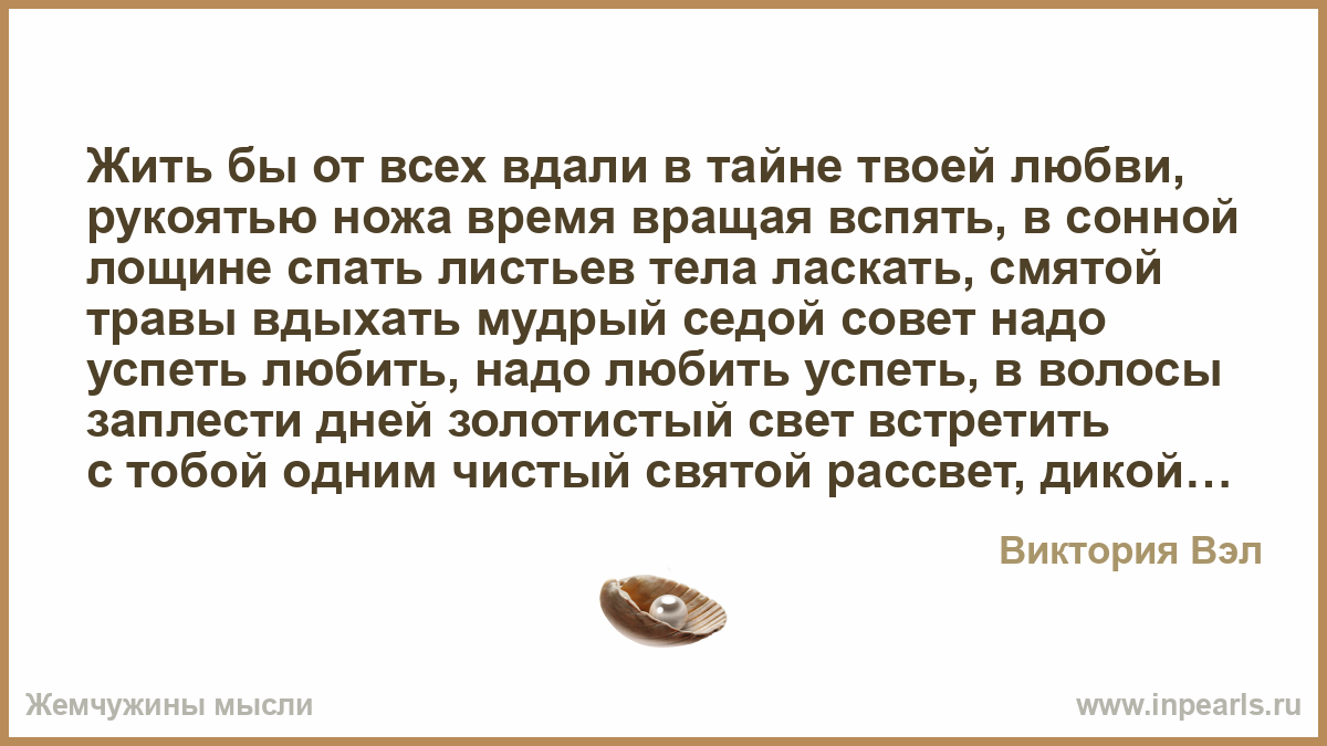 Жить бы от всех вдали в тайне твоей любви, рукоятью ножа время вращая вспять, в сонной лощине спать листьев тела ласкать, смятой травы вдыхать мудрый седой совет надо успеть любить, надо любить успеть, в волосы заплести дней золотистый свет встретить с тобой одним чистый святой рассвет, дикой малины вкус с губ утирая сласть, мне бы с тобой уйти мне бы с тобой пропасть пить бы с тобою жизнь из одного ручья — если бы ты не ты, если бы я не я.