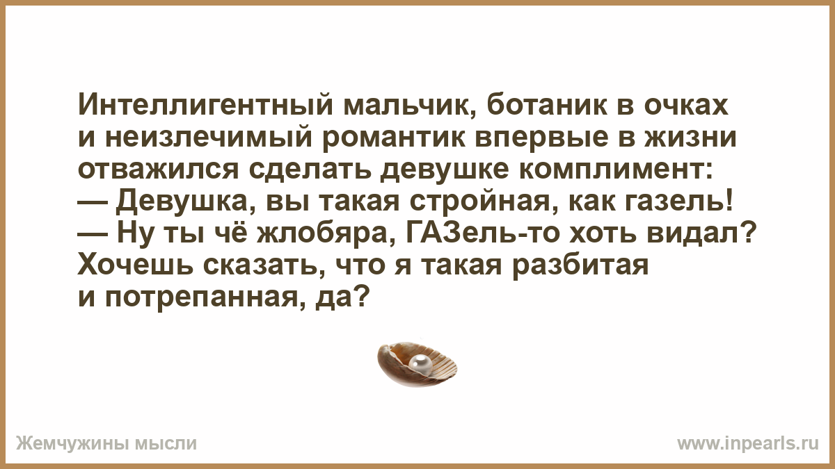Интеллигентный мальчик, ботаник в очках и неизлечимый романтик впервые в жизни отважился сделать девушке комплимент: