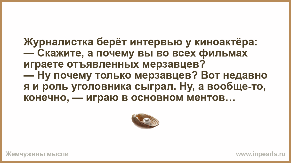 Журналистка берёт интервью у киноактёра: — Скажите, а почему вы во всех фильмах играете отъявленных мерзавцев? — Ну почему только мерзавцев? Вот недавно я и роль уголовника сыграл. Ну, а вообще-то, конечно, — играю в основном ментов…