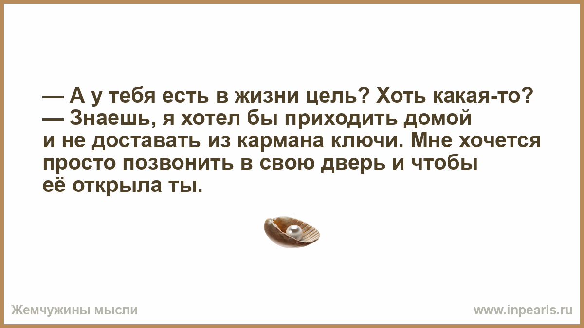 — Знаешь, я хотел бы приходить домой и не доставать из кармана ключи. Мне хочется просто позвонить в свою дверь и чтобы её открыла ты.