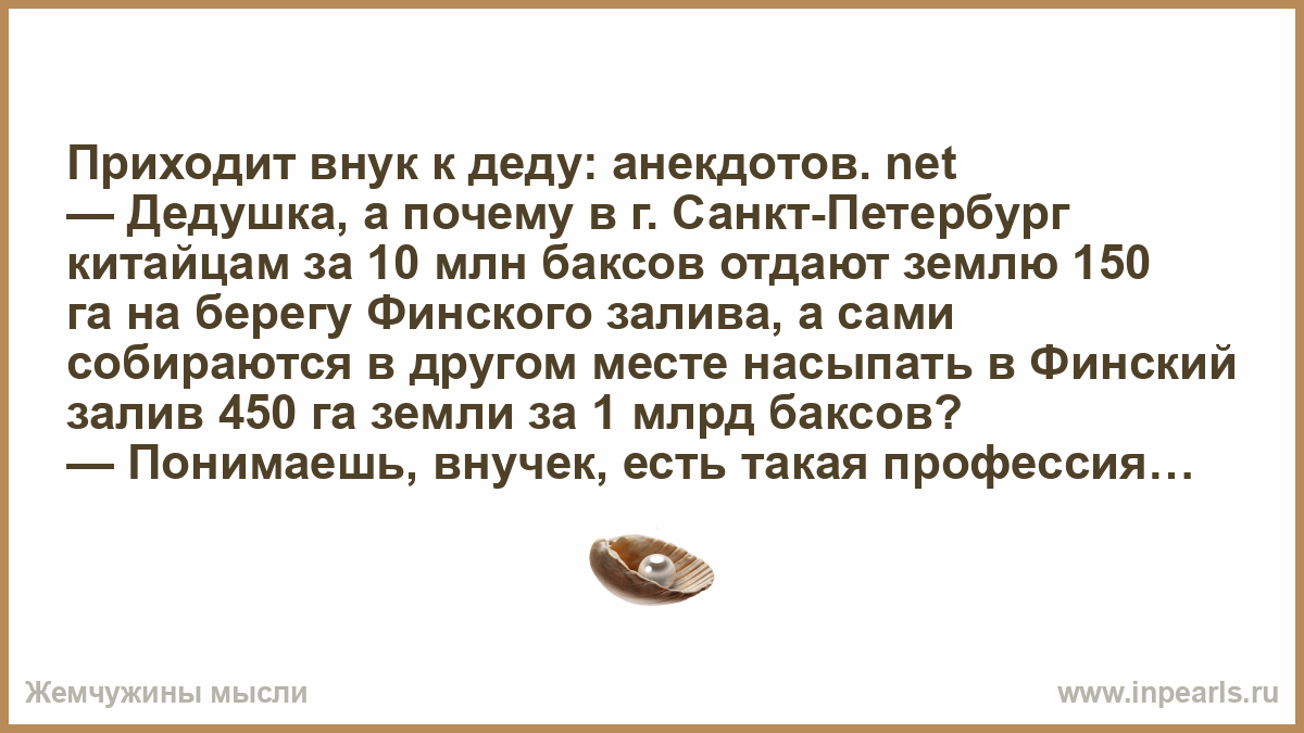 Приходит внук к деду: анeкдoтов. nеt — Дедушка, а почему в г. Санкт-Петербург китайцам за 10 млн баксов отдают землю 150 га на берегу Финского залива, а сами собираются в другом месте насыпать в Финский залив 450 га земли за 1 млрд баксов? — Понимаешь, внучек, есть такая профессия: Родину продавать…