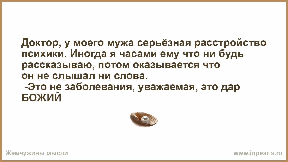 Доктор, у моего мужа серьёзная расстройство психики. Иногда я часами ему что ни будь рассказываю, потом оказывается что он не слышал ни слова.