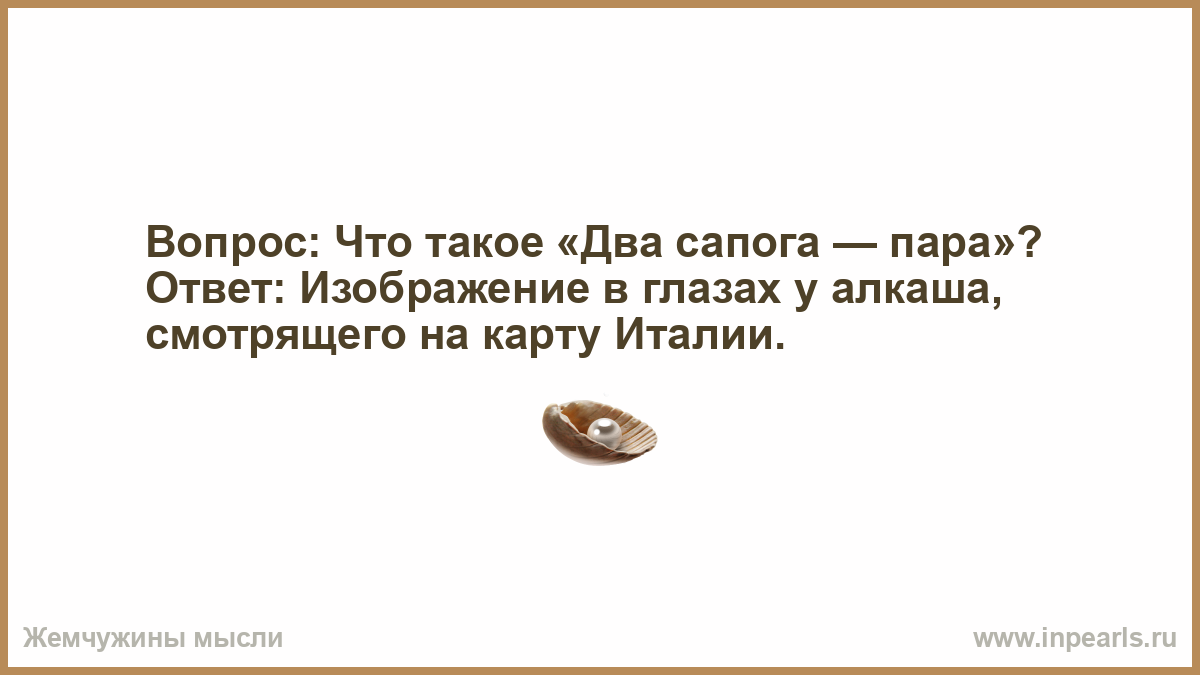 Вопрос: Что такое «Два сапога — пара»? Ответ: Изображение в глазах у алкаша, смотрящего на карту Италии.