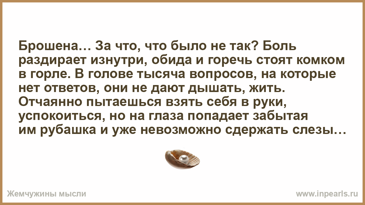 Брошена… За что, что было не так? Боль раздирает изнутри, обида и горечь стоят комком в горле. В голове тысяча вопросов, на которые нет ответов, они не дают дышать, жить. Отчаянно пытаешься взять себя в руки, успокоиться, но на глаза попадает забытая им рубашка и уже невозможно сдержать слезы. Подруги утешают, сочувствуют и стараются помочь «ценными» советами… Сейчас самое главное — терпение, подождите, когда немного утихнет острая боль, вы сможете трезво оценить ситуацию, разобраться в ее причинах, разобраться в себе. Может быть, ваши отношения изжили себя и спасать больше нечего, может любовь давно уступила место привычке, просто муж понял это раньше вас. Тогда стоит ли мучить партнера и саму себя, создавая видимость крепкой семьи, уж лучше перевернуть эту страницу и идти дальше. Но если время только укрепило вас в мысли, что муж единственный мужчина в вашей жизни, и что именно с ним вы хотите встретить старость, что любовь не ушла, просто с возрастом ее проявления стали более спокойными, только тогда за эти отношения стоит побороться.