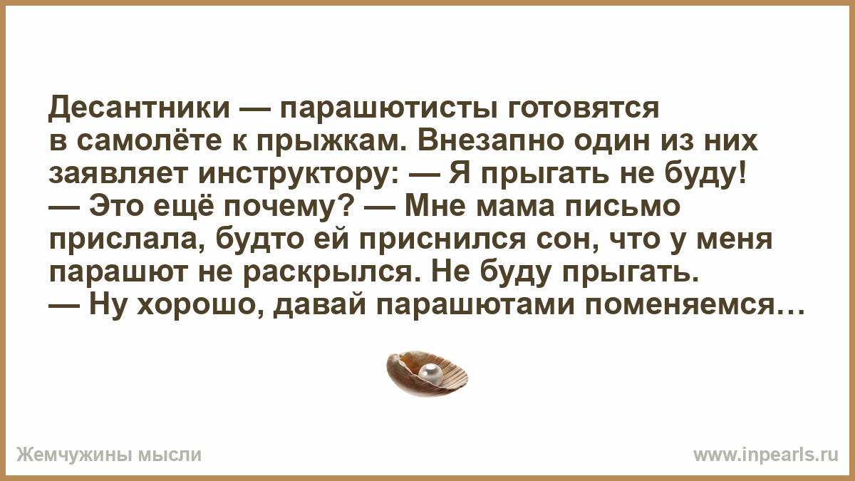 Десантники — парашютисты готовятся в самолёте к прыжкам. Внезапно один из них заявляет инструктору: — Я прыгать не буду! — Это ещё почему? — Мне мама письмо прислала, будто ей приснился сон, что у меня парашют не раскрылся. Не буду прыгать. — Ну хорошо, давай парашютами поменяемся! Поменялись. Десантник прыгнул. Парашют нормально раскрылся, спокойно опускается. Вдруг рядом проносится инструктор со свистом: — Фьють твою мать!..
