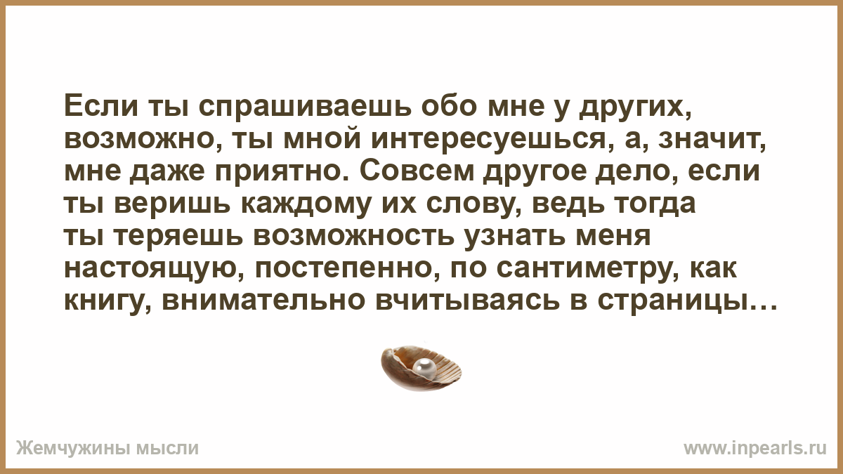 Если ты спрашиваешь обо мне у других, возможно, ты мной интересуешься, а, значит, мне даже приятно. Совсем другое дело, если ты веришь каждому их слову, ведь тогда ты теряешь возможность узнать меня настоящую, постепенно, по сантиметру, как книгу, внимательно вчитываясь в страницы. Увы, если ты веришь тому, что говорят обо мне другие, то оставайся с ними до конца, мне важнее, чтобы верили мне.