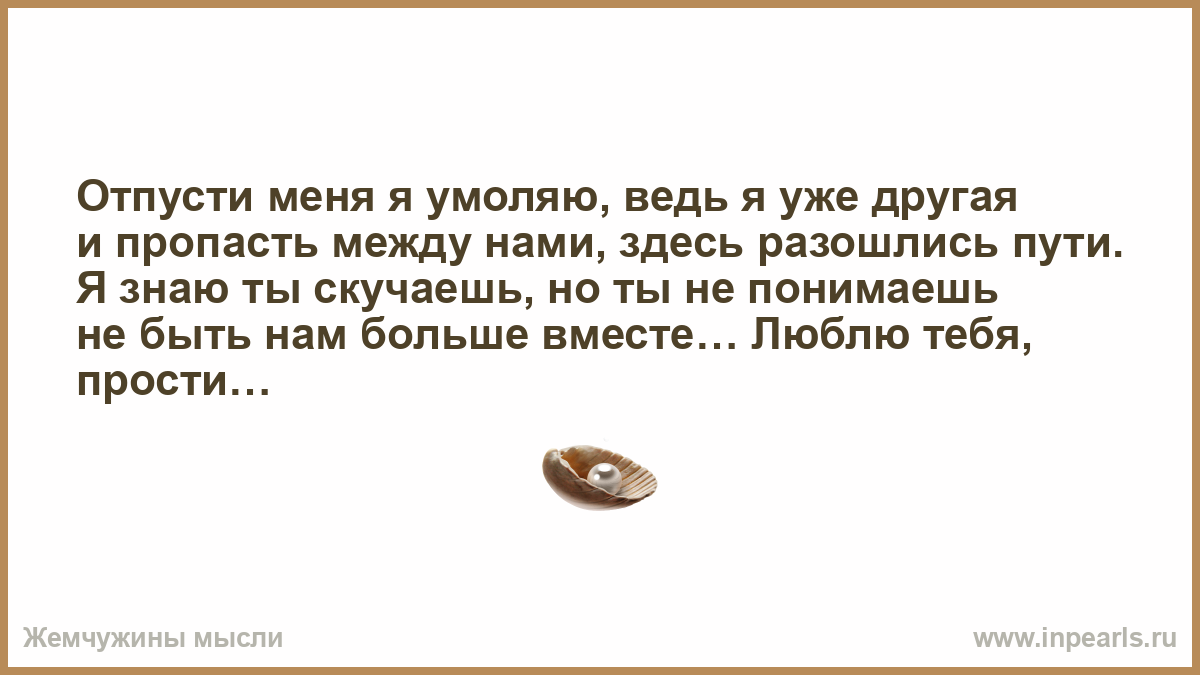 Отпусти меня я умоляю, ведь я уже другая и пропасть между нами, здесь разошлись пути. Я знаю ты скучаешь, но ты не понимаешь не быть нам больше вместе… Люблю тебя, прости…