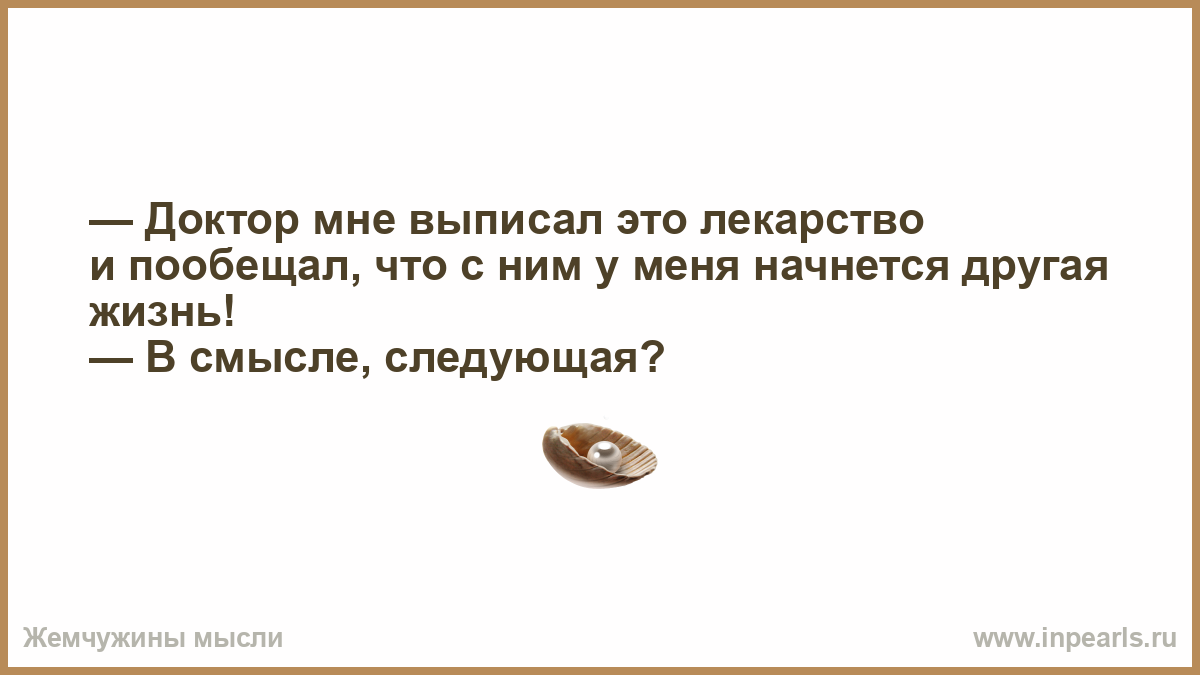 — Доктор мне выписал это лекарство и пообещал, что с ним у меня начнется другая жизнь!