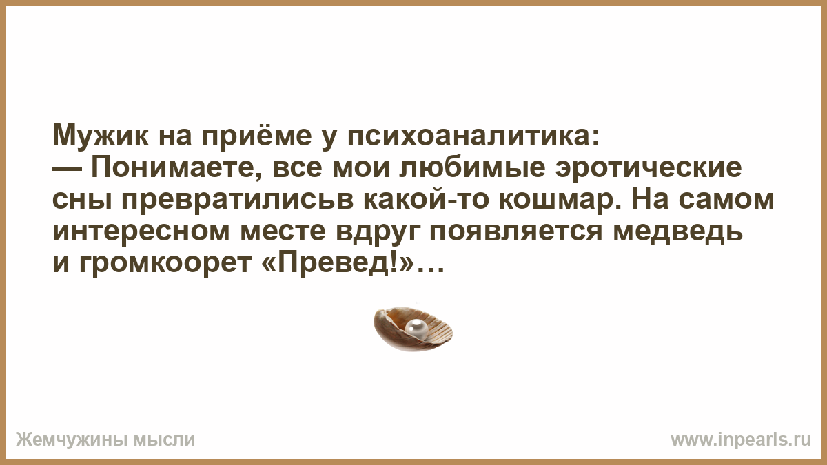 — Понимаете, все мои любимые эротические сны превратилисьв какой-то кошмар. На самом интересном месте вдруг появляется медведь и громкоорет «Превед!»…