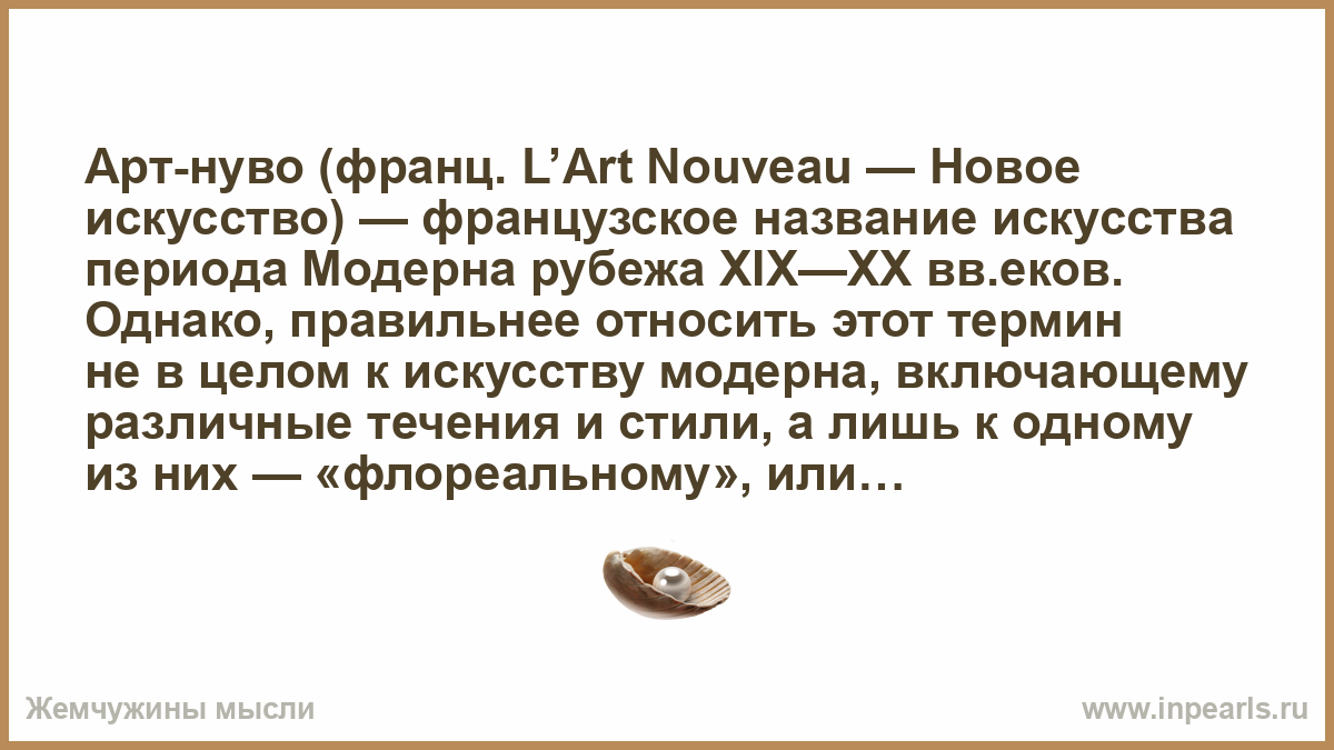 Арт-нуво (франц. L’Art Nouveau — Новое искусство) — французское название искусства периода Модерна рубежа XIX—XX вв.еков. Однако, правильнее относить этот термин не в целом к искусству модерна, включающему различные течения и стили, а лишь к одному из них — «флореальному», или декоративно-орнаментальному, течению и стилю, зародившемуся в Бельгии и Франции.