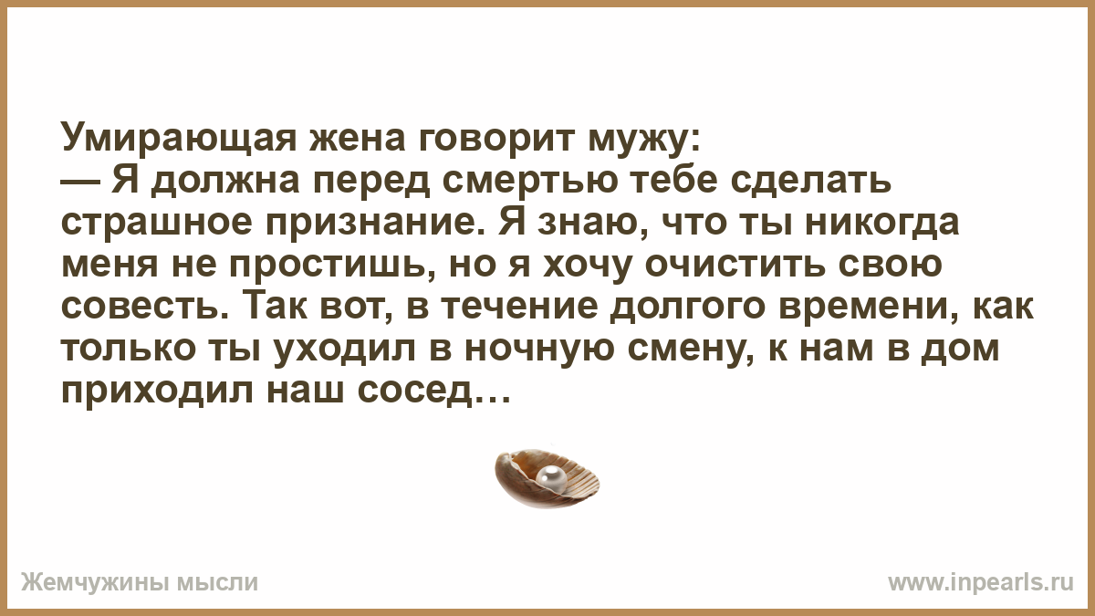 — Я должна перед смертью тебе сделать страшное признание. Я знаю, что ты никогда меня не простишь, но я хочу очистить свою совесть. Так вот, в течение долгого времени, как только ты уходил в ночную смену, к нам в дом приходил наш сосед.