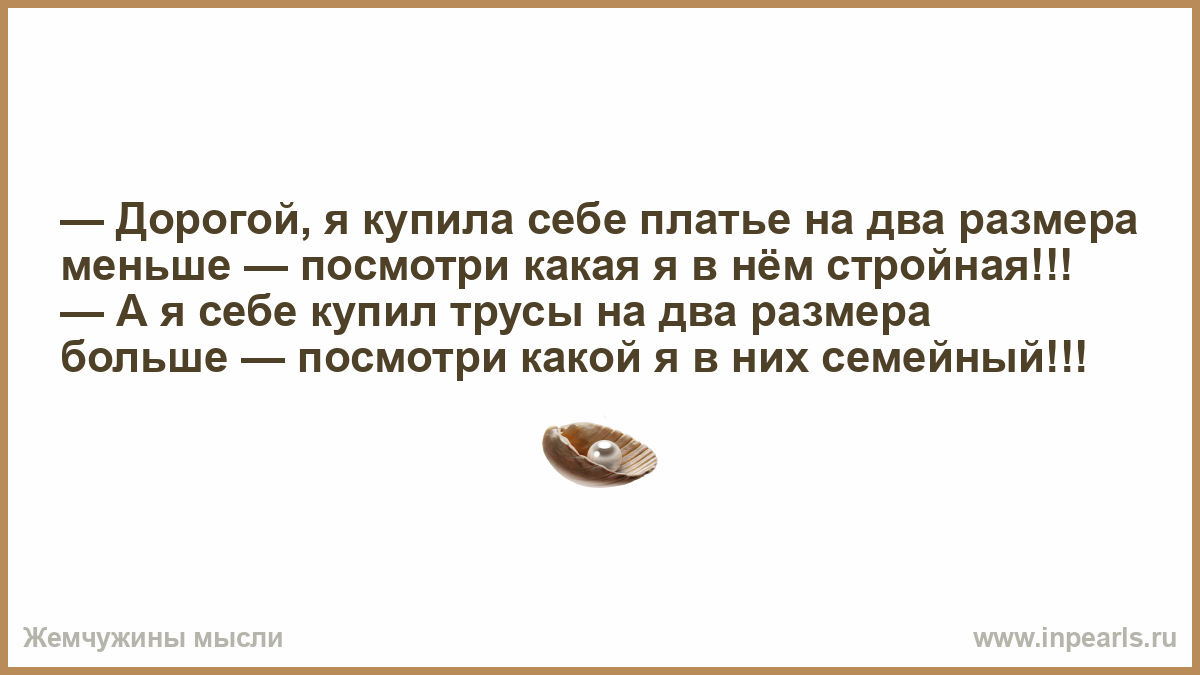 — Дорогой, я купила себе платье на два размера меньше — посмотри какая я в нём стройная!!! — А я себе купил трусы на два размера больше — посмотри какой я в них семейный!!!