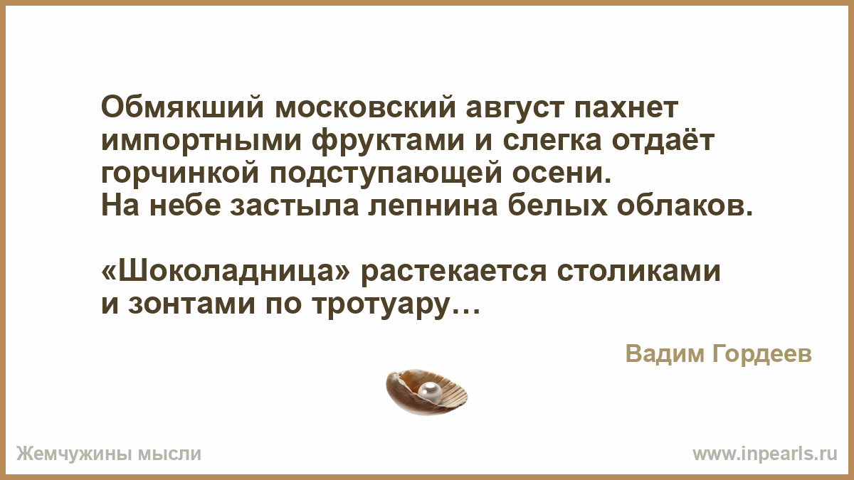 Обмякший московский август пахнет импортными фруктами и слегка отдаёт горчинкой подступающей осени.