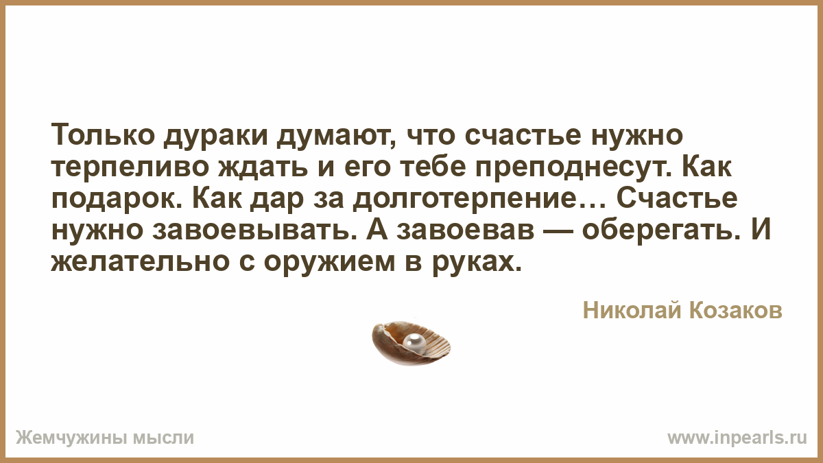Только дураки думают, что счастье нужно терпеливо ждать и его тебе преподнесут. Как подарок. Как дар за долготерпение… Счастье нужно завоевывать. А завоевав — оберегать. И желательно с оружием в руках.