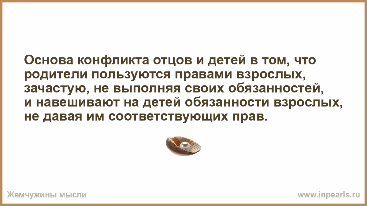 Основа конфликта отцов и детей в том, что родители пользуются правами взрослых, зачастую, не выполняя своих обязанностей, и навешивают на детей обязанности взрослых, не давая им соответствующих прав.