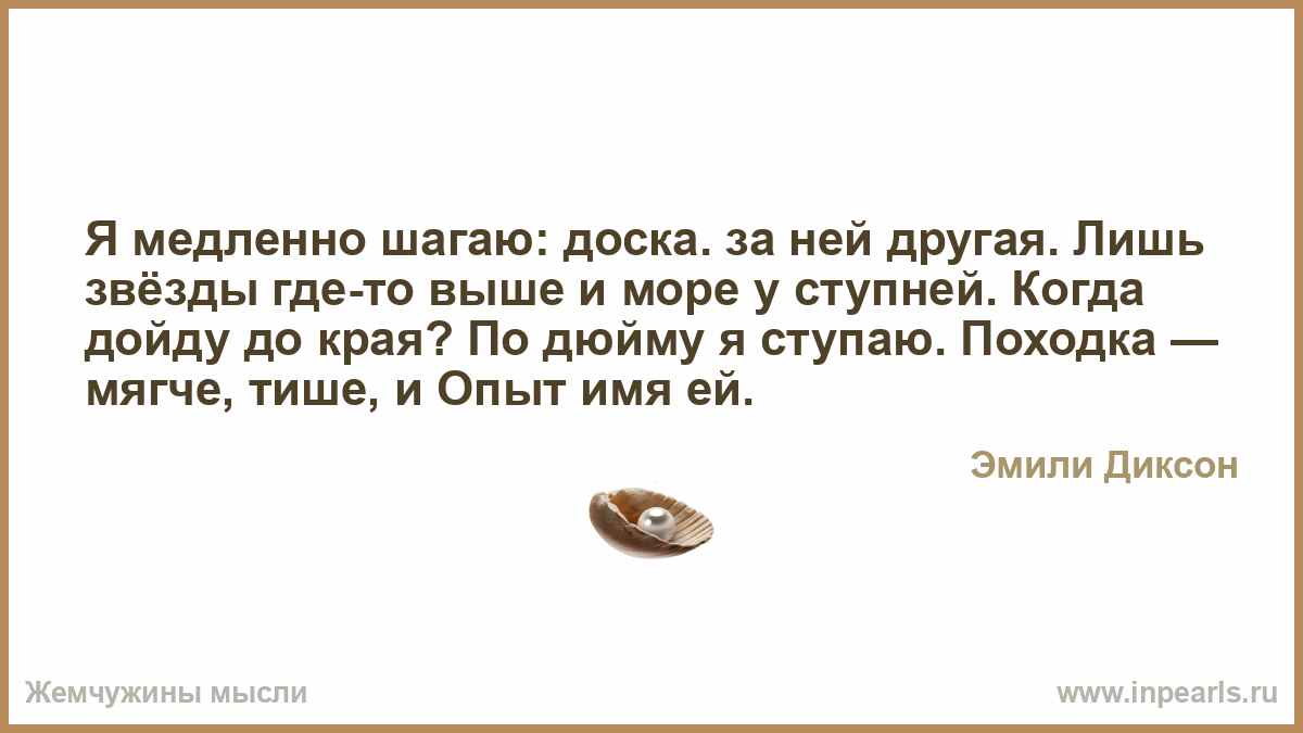 Я медленно шагаю: доска. за ней другая. Лишь звёзды где-то выше и море у ступней. Когда дойду до края? По дюйму я ступаю. Походка — мягче, тише, и Опыт имя ей.