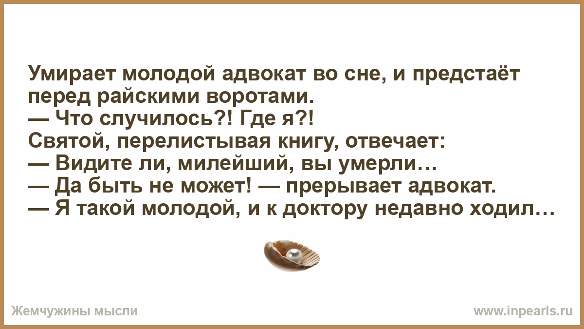 — Да быть не может! — прерывает адвокат. — Я такой молодой, и к доктору недавно ходил на обследование и всё было отлично.