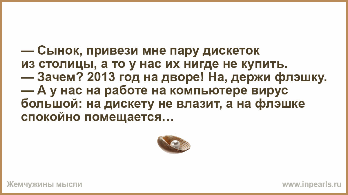 — Сынок, привези мне пару дискеток из столицы, а то у нас их нигде не купить.