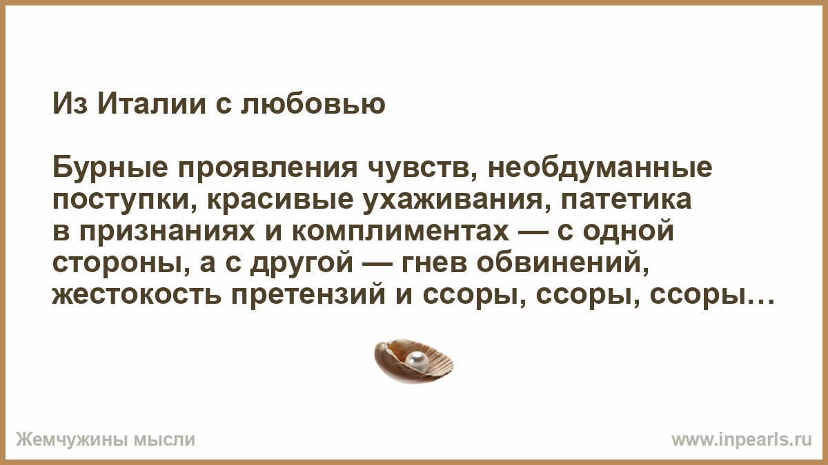 Бурные проявления чувств, необдуманные поступки, красивые ухаживания, патетика в признаниях и комплиментах — с одной стороны, а с другой — гнев обвинений, жестокость претензий и ссоры, ссоры, ссоры… Наверное, все это назвали итальянской любовью, потому что темперамент южной нации предполагает страсти-мордасти и различные веселые приключения в отношениях у соотечественников Феллини и Софи Лорен: дело житейское. Все бы упростилось, если бы дело было только в географии. В наших суровых краях любовь становится резко континентальной тоже довольно часто. Но дается нам это трудно, и результаты не впечатляют.