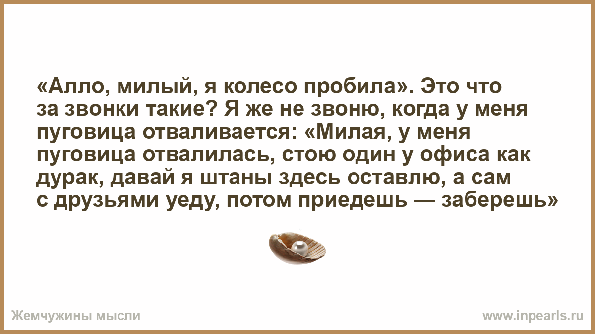«Алло, милый, я колесо пробила». Это что за звонки такие? Я же не звоню, когда у меня пуговица отваливается: «Милая, у меня пуговица отвалилась, стою один у офиса как дурак, давай я штаны здесь оставлю, а сам с друзьями уеду, потом приедешь — заберешь»
