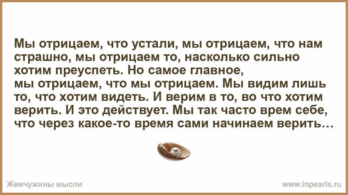 Мы отрицаем, что устали, мы отрицаем, что нам страшно, мы отрицаем то, насколько сильно хотим преуспеть. Но самое главное, мы отрицаем, что мы отрицаем. Мы видим лишь то, что хотим видеть. И верим в то, во что хотим верить. И это действует. Мы так часто врем себе, что через какое-то время сами начинаем верить. Мы так часто все отрицаем, что иногда не можем распознать правду, даже когда она у нас перед носом. Иногда реальность незаметно подкрадывается и кусает нас очень больно. И когда прорывает плотину, нам остается только плыть. Мир иллюзий — это клетка, а не кокон. Мы не можем лгать себе постоянно. Мы устали, мы напуганы. Отрицание не меняет правды. Рано или поздно, но нам придется отказаться от отрицания и встретиться с миром лицом к лицу. Отрицание — это не река, это целый океан. Так как же нам в нём не утонуть?