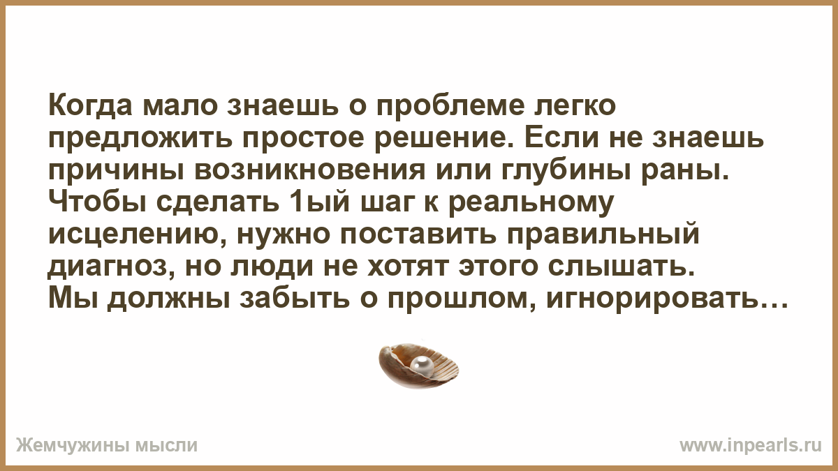 Когда мало знаешь о проблеме легко предложить простое решение. Если не знаешь причины возникновения или глубины раны. Чтобы сделать 1ый шаг к реальному исцелению, нужно поставить правильный диагноз, но люди не хотят этого слышать. Мы должны забыть о прошлом, игнорировать возможные осложнения в будущем и просто быстренько всё залатать.